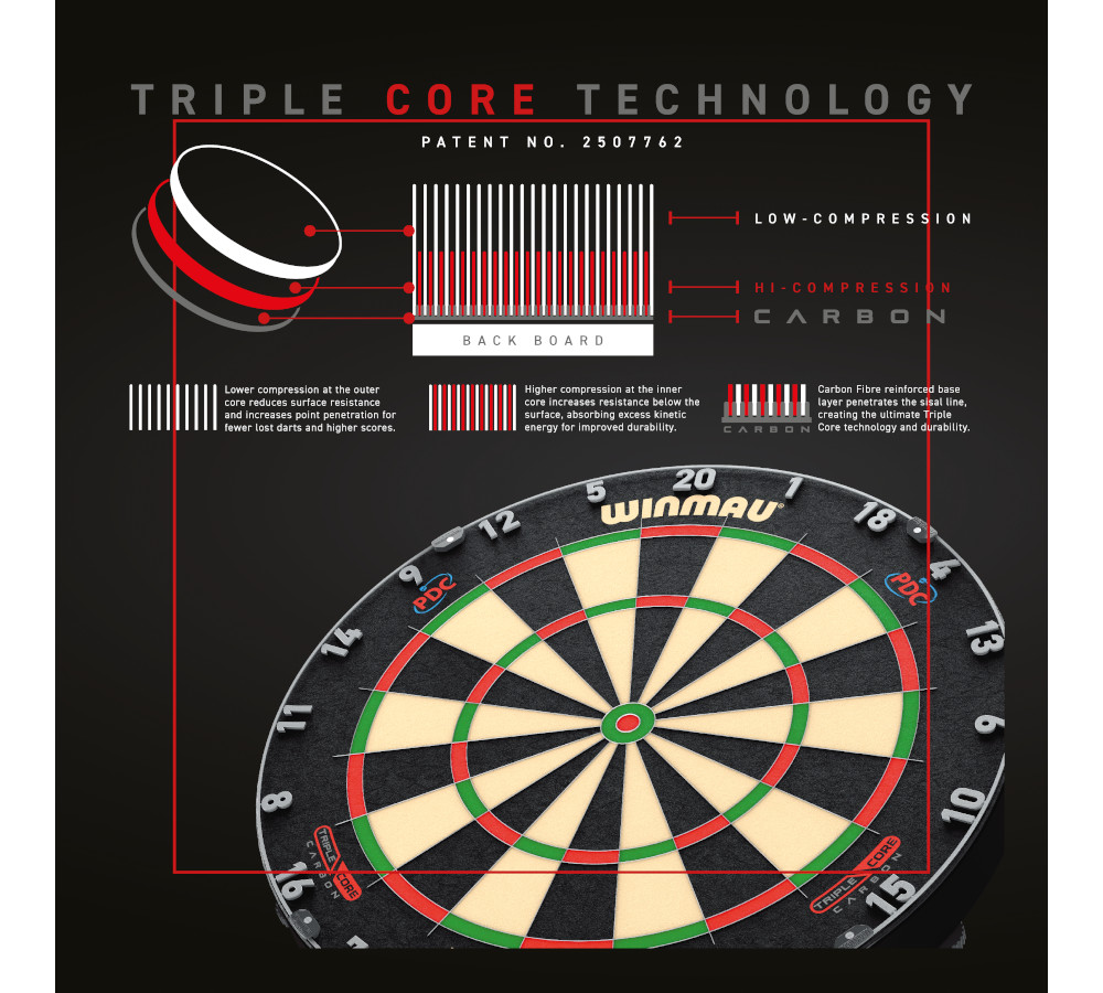 Omdat precisie essentieel is, combineert de Triple Core-constructie drie verschillende lagen sisal voor maximale dichtheid en kracht. Hierdoor dringen de dartpijlen dieper en stabieler in het bord. Bovendien zorgt deze technologie voor een langere levensduur én minder bounce-outs.