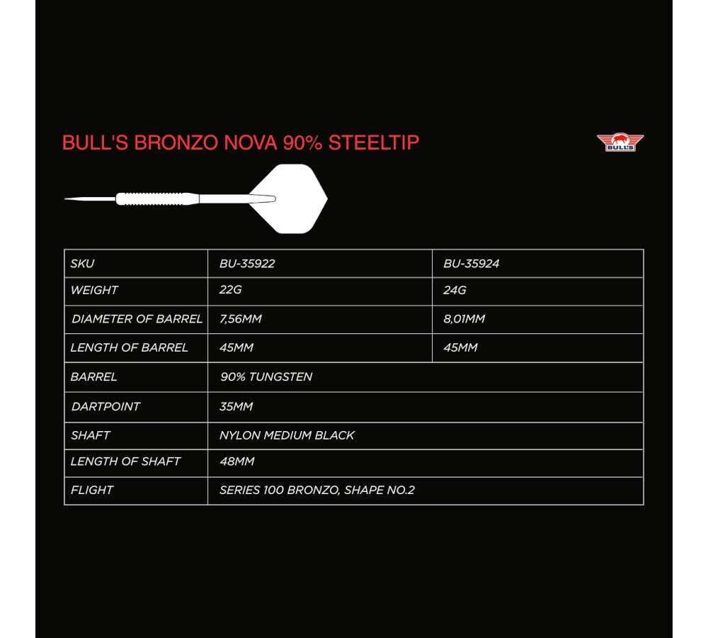 De Bronzo Nova is gemaakt van 90% tungsten. Dit materiaal staat bekend om zijn hoge dichtheid en duurzaamheid. Het slanke profiel biedt extra ruimte in het triple vak. Dit vergroot het potentieel voor strakkere worpen. De barrel heeft een druppelvormig ontwerp voor optimale balans. De gebogen achterkant ondersteunt een natuurlijke vingerpositie. Deze vorm bevordert een stabiele en gecontroleerde vlucht. Ook bij intensief gebruik blijft de kwaliteit behouden.