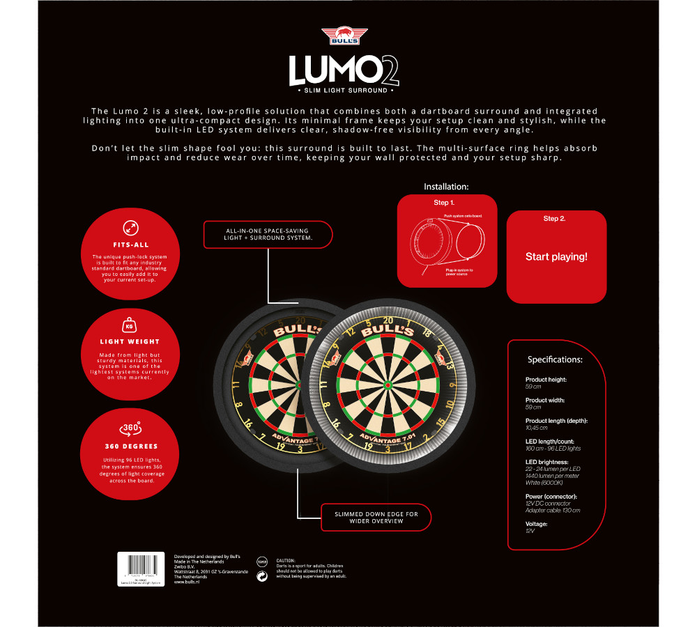 De Lumo 2 Surround Light System is een doorontwikkeling van de bekende Lumo. Bovendien is dit systeem ontworpen voor darters die maximale zichtbaarheid willen. Daardoor speel je met meer precisie en comfort.