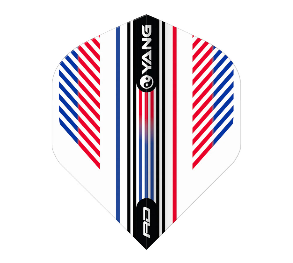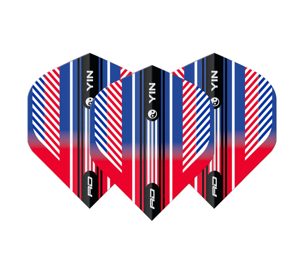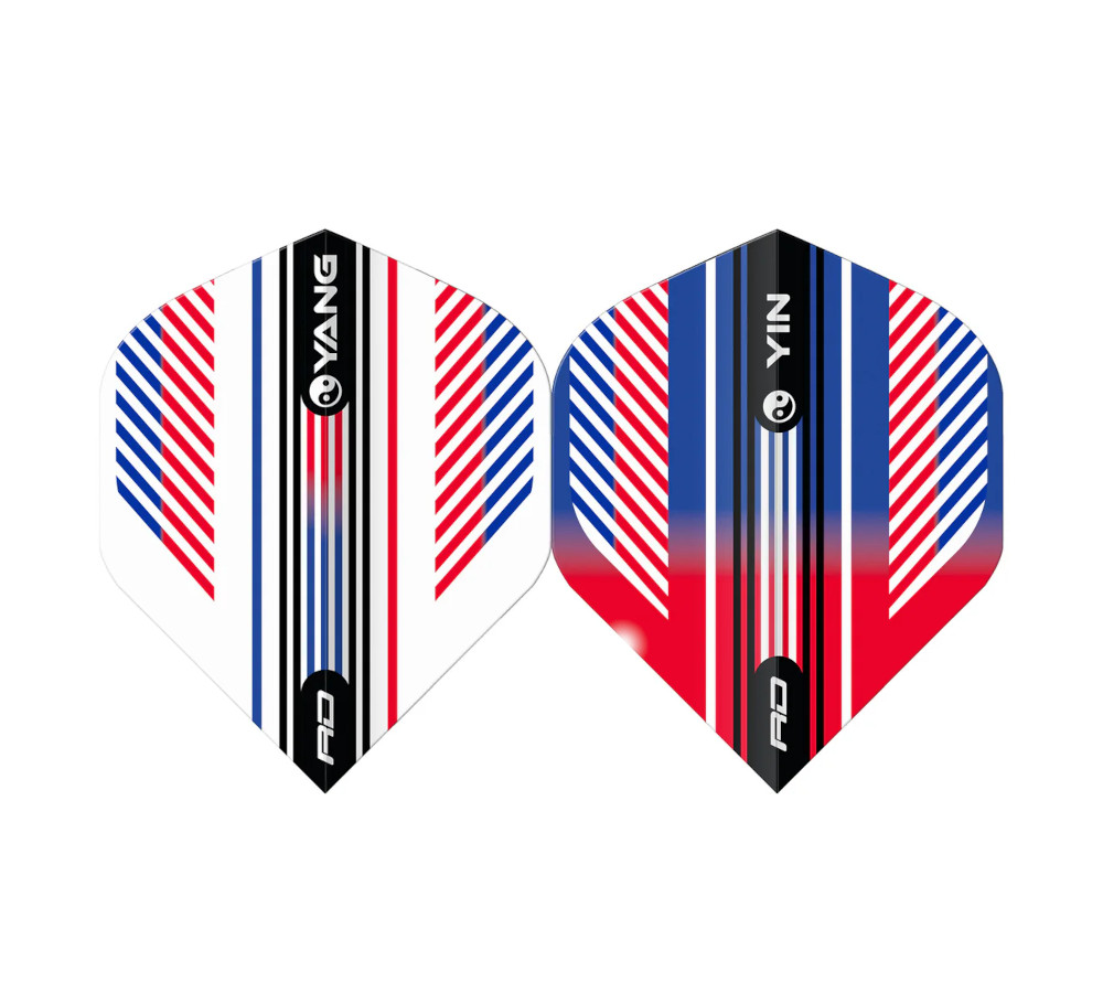 Red Dragon Red & Blue Yin Yang Flight van 100 micron. Duurzaam, stabiel en ideaal voor nauwkeurige worpen en herkenbare stijl.