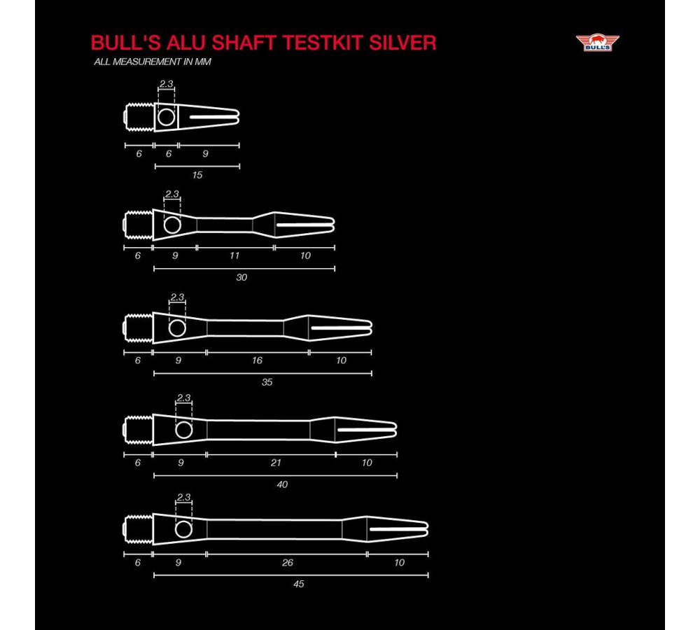 Bull’s Simplex Aluminium Shaft Test Kit met 5 lengtes van 15 tot 45 mm. Ideaal voor het vinden van jouw perfecte dartbalans en controle.